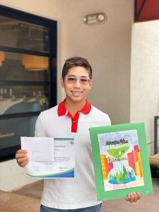 Congratulations to our artists for their commitment to protect our environment and water resources by calling attention to climate change through their thoughtful and provocative art. We met with these students in Carlsbad on May 1, 2022, to recognize and celebrate them with a congratulatory certificate from SanDISCA and to deliver the cash awards. It was a fun and exciting event for the artists, their instructor and their parents.