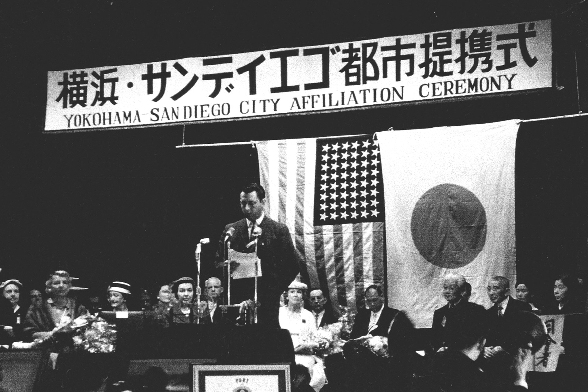 San Diego’s sister-city affiliation with Yokohama began in 1955 following a trip to Yokohama by the then Mayor Charles Dail and then Port Director John Bate to attend the Japan – American Pacific Area Conference of Mayors. On October 29, 1957 under Mayor Dail the City of San Diego approved an ordinance creating the San Diego Yokohama Friendship Commission governed by a board appointed by the City Council.