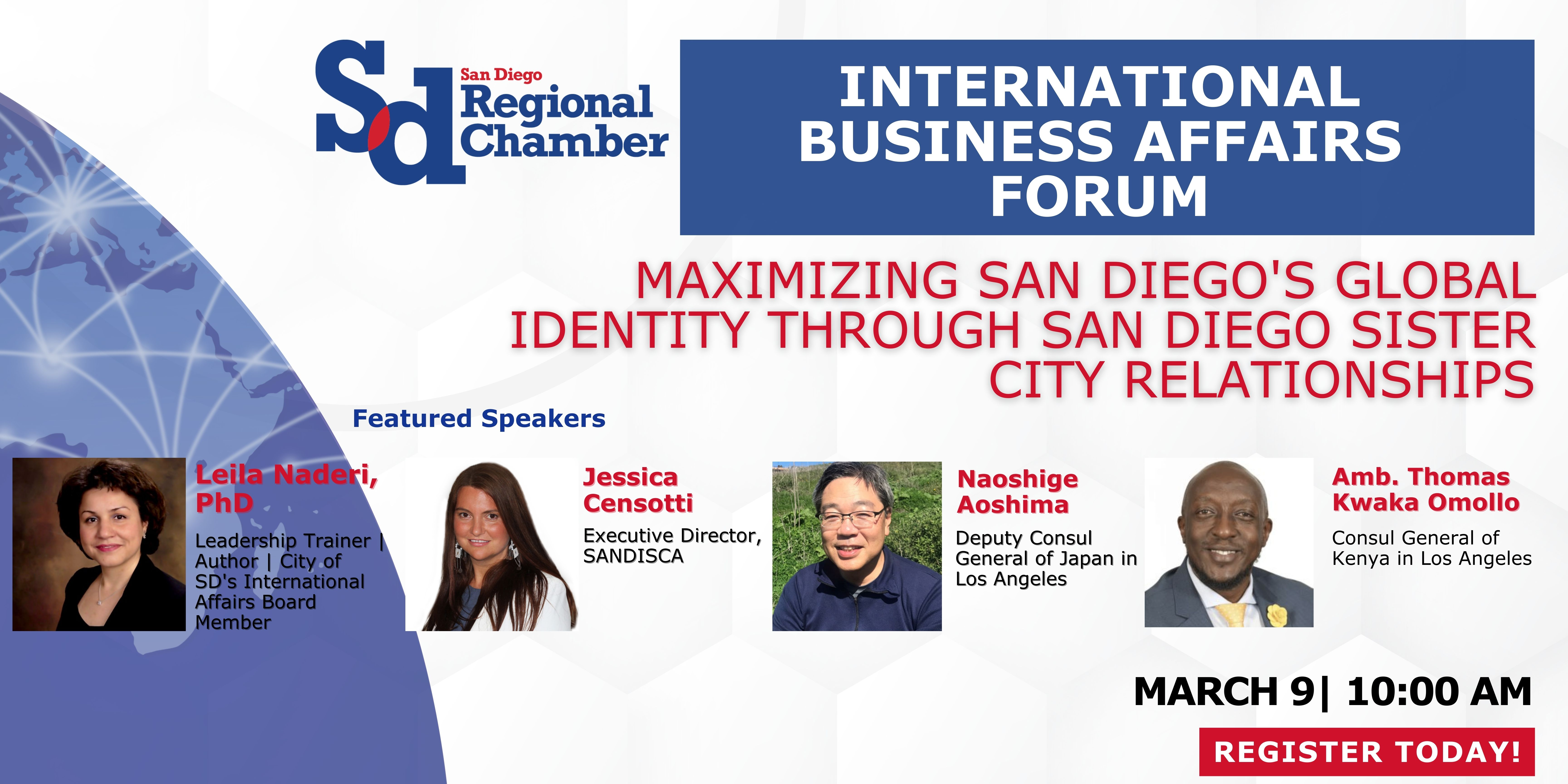 Join us on March 9 for a conversation on fostering international ties throughout the San Diego Sister Cities Association by supporting cultural, educational, and economic relationships. Speakers will also share an overview of San Diego’s Sister City relationships with Yokohama, Friendship Cities program with Amboseli, Kenya, and the stories of many other cities that have collaborated with the organization in planning and implementing cooperative activities and exchanges.